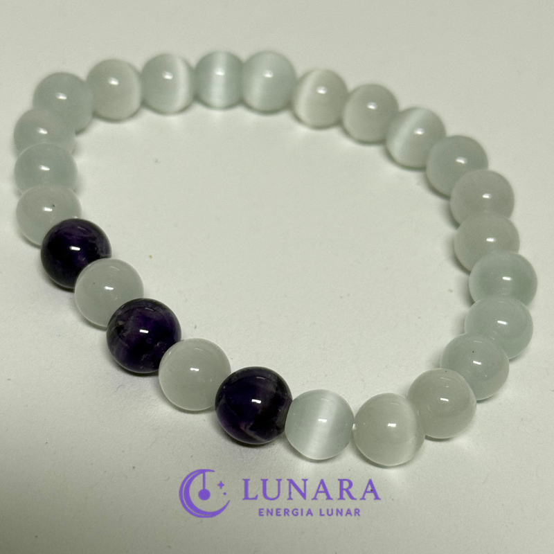 A Pulseira Selenite & Ametista une duas pedras profundamente espirituais, criadas para elevar a vibração, acalmar a mente e purificar o campo energético.